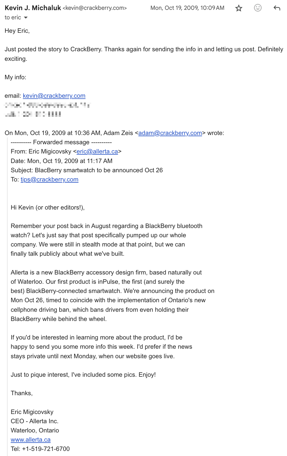 2025 Note - Kevin from Crackberry was the first person in the press who covered us! The timeline was crazy - I sent him this email and he phoned me like 5 minutes later. He posted about inPulse an hour later, setting off our first viral explosion