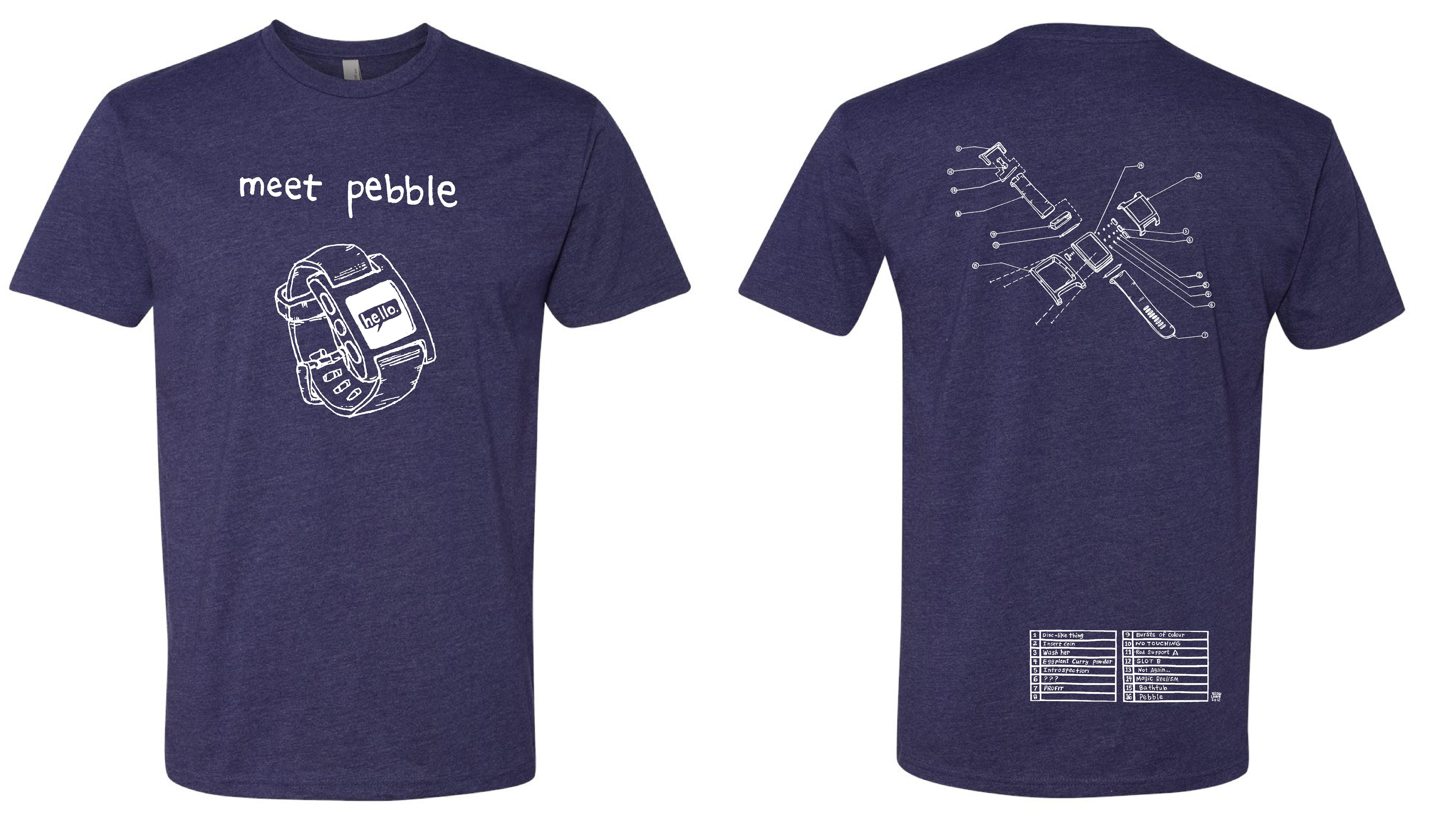 Here's the backstory behind this t-shirt. In 2011, the early Pebble team went on an off-site for a week to Portland, Oregon. While we were staying there, I had to shop at the 'Put A Bird On It' store. I bought a t-shirt that I ended up wearing in the original Kickstarter video. After the Kickstarter went viral, the creator of the t-shirt Jessica Lynch reached out and offered to make us a custom t-shirt. Naturally, we said yes! She designed this beautiful 'Meet Pebble' t-shirt. Only ~50 were made with the original 3D CAD exploded view illustration on the back, as a special edition for the first Pebble employees. We made thousands in more different colors, but only with the front illustration.